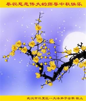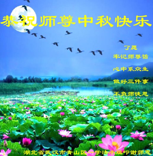 在最后的时间里我们将谨记师尊的教诲,努力修好自己,做好三件事,助师世间行! 湖北省武汉一大法弟子恭祝师尊中秋节好!