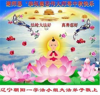 辽宁朝阳大法弟子恭祝慈悲伟大的师尊中秋节快乐!感恩师尊的慈悲苦度! 在以后的时间里,朝阳大法弟子一定会更加严格要求自己,形成整体,做好三件事,让师父多一些欣慰! 辽宁朝阳市一学法小组大法弟子恭祝慈悲伟大的师尊中秋节快乐!