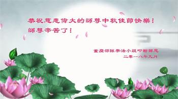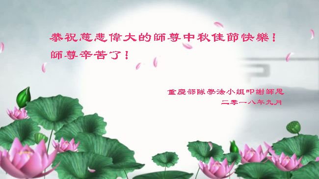 山西国防军工系统大法弟子恭祝慈悲伟大的师尊中秋节快乐! 师父啊:您为挽救满苍宇的众生,从大穹之顶层层下走,历经亿万年沧桑岁月,轮回转生,您至高无上的洪大慈悲、洪恩浩荡,为众生操尽了心,师尊辛苦了,千言万语也表达不了我们对您的祝愿和思念! 弟子跪谢师尊!合十! 重庆部队学法小组大法弟子恭祝慈悲伟大的师尊中秋佳节快乐!