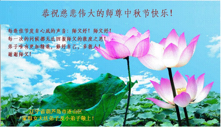 辽宁省葫芦岛市连山区一家母女大法弟子及小弟子恭祝慈悲伟大的师尊中秋节快乐!