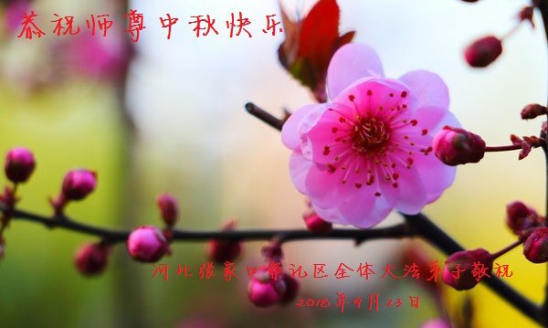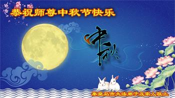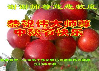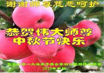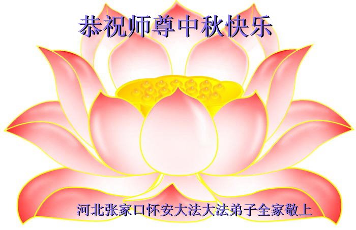师父您好!您辛苦了!在这中秋节即将来临之时,我们夫妻二人恭祝师父节日快乐!师父,您为宇宙的更新,大穹众生的得救,弟子的修炼,日夜在操劳。弟子用尽人间的语言也无法表达对您的感恩,只有在今后的修炼中按照您的要求,精進!精進!再精進! 河北省张家口一大法弟子携全家十六口恭贺伟大的师尊中秋节快乐!