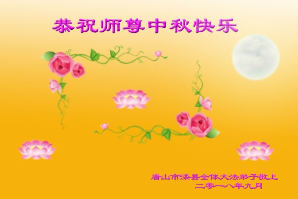 河北省唐山市曹妃甸区大法弟子恭祝师尊中秋快乐! 中秋月儿圆 阖家赏月欢 弟子心企盼 师尊早日还 每日精進修 无愧见师颜 欢庆大法日 众生喜连连 2018年9月20日 河北省秦皇岛全体大法弟子恭祝师尊中秋快乐!