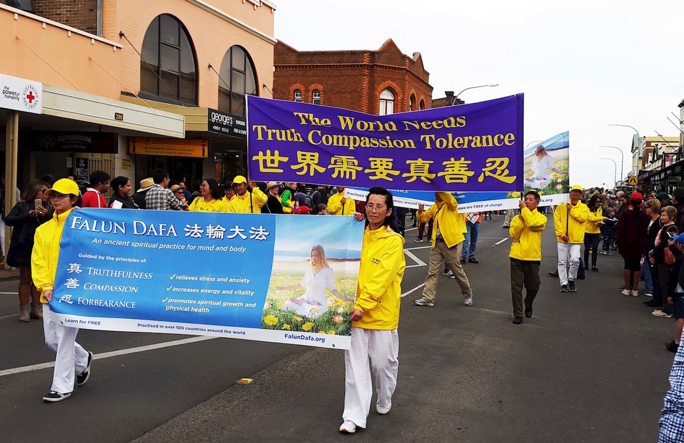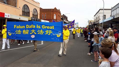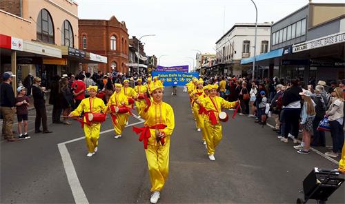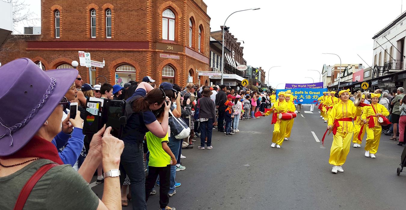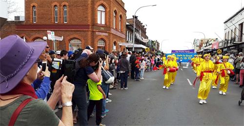 乔丹(Jordan)和艾比(Abby Fuller)两个女孩也在游行表演行列,她们在等候游行时就让法轮功腰鼓队的声声鼓韵给震撼了,她们喜欢无比,并且一再用“惊人的美好!”和“很酷!”来赞誉腰鼓队。她们表示:“那个法轮功腰鼓队的表演令我们感觉惊人的美好!他们能这么连贯不停的击鼓并保持和谐的鼓韵,让我们惊叹,真是精湛不已! ” 内维尔(Geoff Neville)先生表示:“法轮功游行队伍非常美好,让我们感觉非常赏心悦目,特别是腰鼓队的表演能量场强大、震撼人心!他们表演的鼓乐让人感觉祥和舒缓,他们给整个游行增添了许多活力和激情,令人兴奋鼓舞。” 有些澳洲人对着法轮功游行队伍竖起大拇指说:“做得好,你们(法轮功)非常了不起!” 一位澳洲女士特意走到身着金黄服装的法轮功学员李女士前告诉她说:“我在以前听说过法轮功被中共迫害的事,中共太邪恶恐怖了。你们今天能站出来展示法轮大法的美好和揭示迫害太好了,太了不起了!感谢你们来到这里告诉我们真相!”