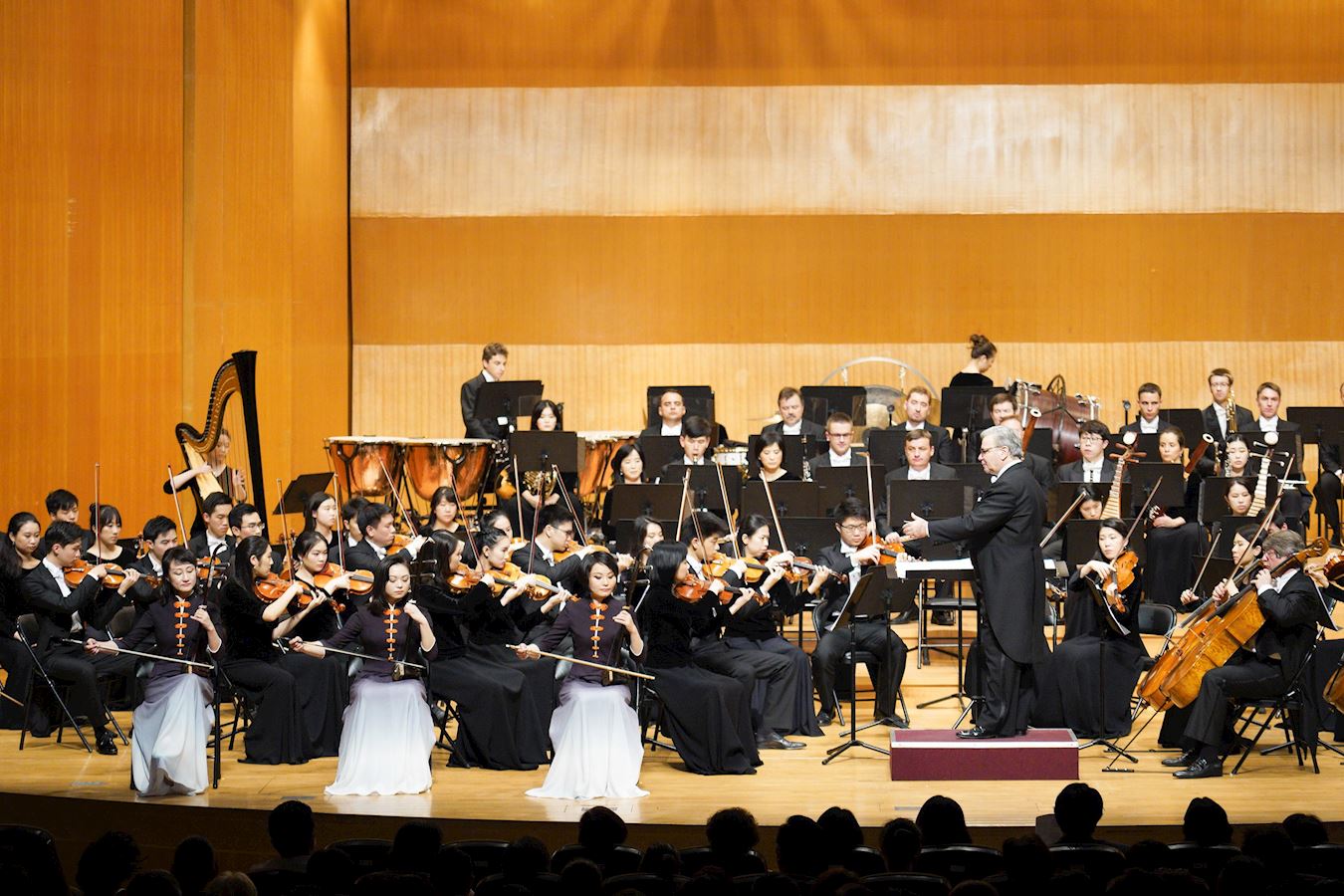 图3:神韵交响乐团在新竹演出,前排为二胡演奏家戚晓春(左)、王真(中)、琴露(右)。 |