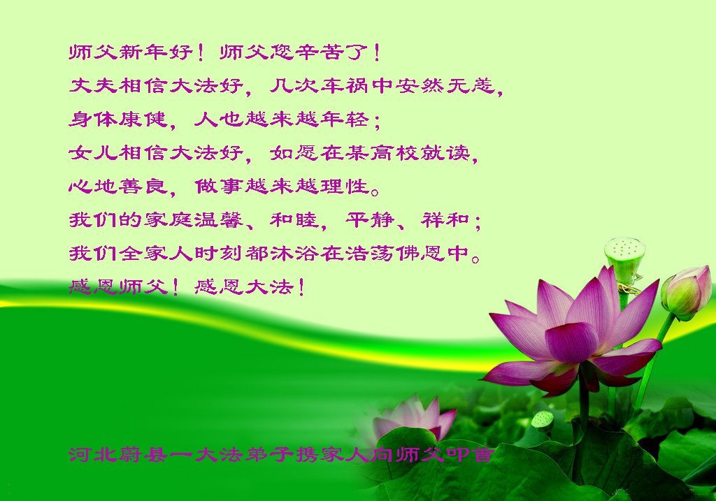 河北张家口市蔚县一大法弟子携家人恭祝师父新年快乐!
