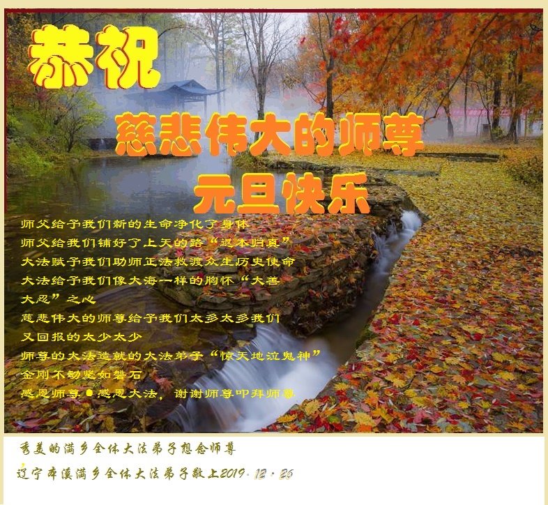 【明慧网二零一九年十二月二十九日】 辽宁省本溪县清河城镇望城村一大法弟子恭祝师父新年快乐!
