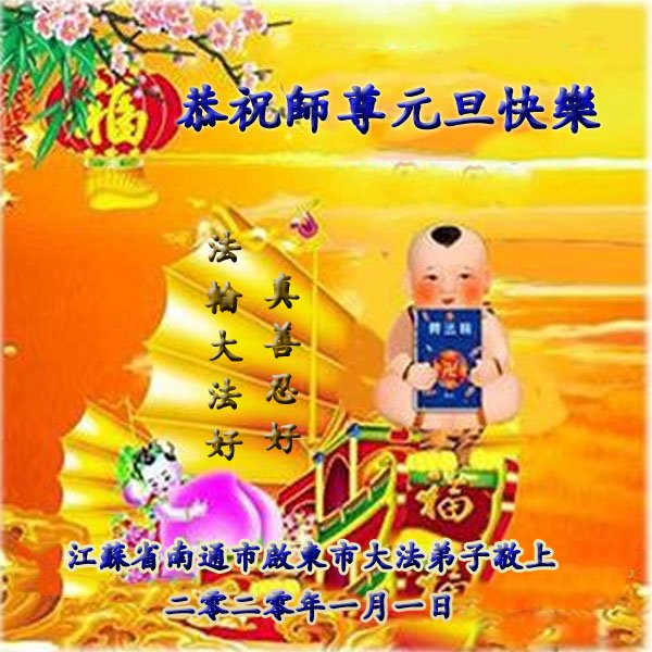 江苏省南通市启东市大法弟子恭祝慈悲伟大的师尊新年快乐! 人间任何美好的词句都表达不尽弟子对师尊的感恩,弟子倍感这一刻值千金,值万金,只有抓紧时间精進实修,做好“三件事”,多救世人,以报师恩!圆满随师还。 江苏省南通市大法小弟叩拜,恭祝慈悲伟大的师尊元旦快乐!