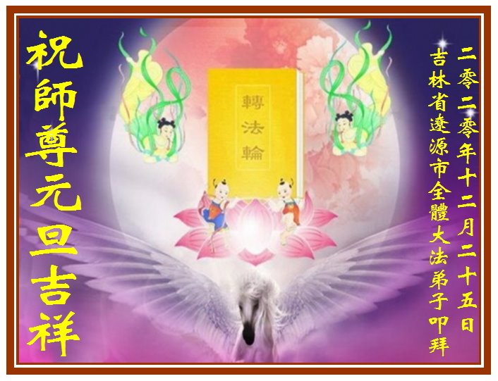 赐福大浪淘沙又一年 历经百炼真金显 若非只身闯天涯 请赐师尊连珠线 单珠落地渐黯然 固守执着借口全 不知大难生死劫 安逸享乐毁瞬间 正邪大战已末端 筋疲力竭法无边 重整旗鼓再请战 师赐智勇完大愿 愿去根执不惧痛 冥顽顿化冰雪溶 心源师尊同大法 万事俱备有东风 师尊,弟子惭愧,以往祝贺师尊节日快乐时,都没有今天这么沉重,再怎样都有让弟子觉的有向师尊汇报的成绩,但是这次,连续数月给师尊法像上香都看到泪水涟涟的师尊,开始还以为只是自己没达到师尊要求,可是现在才明确师尊的泪水不是只留给了自己。师尊为了弟子们和众生耗尽了自己的一切,使尽了全力,可是弟子才认识到自己以往诸多的不足,没能真正达到法的标准,导致今天长久以来消沉的局面,弟子知错,弟子想按照大法归正一切。 师尊,请慈悲弟子们,赐给弟子百折不挠的勇气,赐给弟子面对这些死抱党文化却不自知的同修时能容下他们各种刺激弟子执着的各种表现的容量,弟子正在努力在任何事态发生时不再动心,弟子不愿再因失望和无望而消沉下去,也不愿再看到同修沉迷执着而自毁,这些年正邪大战,期间虽有成绩斐然,但也有损兵折将……弟子愿舍尽自己的一切同化大法,圆容师尊所要,为师尊所用,请师尊加持护佑,走好最后的路。 弟子遥拜师尊,恭祝师尊二零二零年元旦快乐! 吉林省辽源市东丰县全体大法弟子 叩拜 二零一九年十二月二十四日 吉林省辽源市大法弟子恭祝元旦快乐!