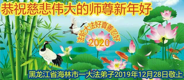 伊春市金林区大法弟子恭祝慈悲伟大的师父新年快乐! 一九年在师父的慈悲保护下,磕磕绊绊的走过来了,有做得好的地方更多是做得不足之处。弟子知道师父延续来的时间,是在等待我这不争气的弟子尽快修到位,弟子已经意识到一些执着,也在努力的突破,请师父放心,我一定会做好的!弟子不忘师恩,紧跟师父正法進程,修好自己的同时,促進同修修炼,比学比修,放下自我,整体提高,做好师父要求的三件事,兑现誓约,与同修们一块跟师父回家! 黑龙江省伊春市金林区全体大法弟子祝愿师父新年快乐!