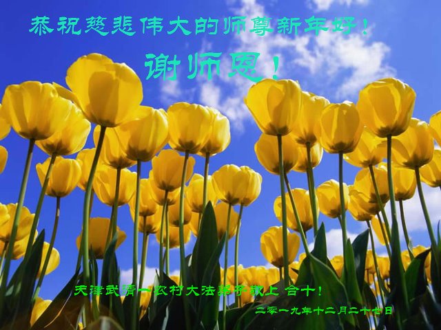 尊敬的师父新年好! 师父辛苦了!弟子祝慈悲伟大的师父新年快乐!感恩师父慈悲苦度,感恩师父把一个满身污浊的生命,净化成一个无私的生命。师父为救度无量众生,不知吃了多少苦,弟子用尽人类的语言也无法表达对师父的感恩。弟子只有精進实修,做好三件事以报师恩。 秦皇岛昌黎全体农村大法弟子 二零一九年十二月二十八日 山东省烟台市海阳市农村大法弟子恭祝慈悲伟大的师尊新年快乐!