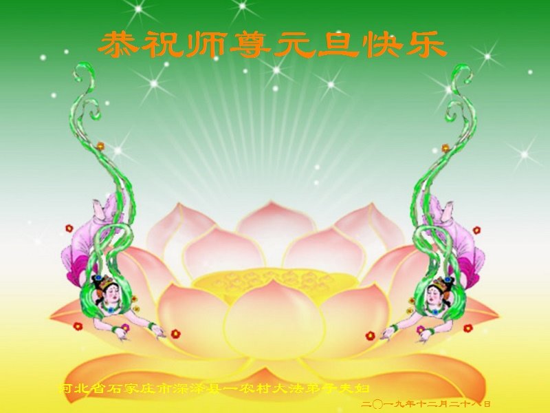元旦佳节,我们共同合十,恭祝慈悲伟大的师尊新年快乐!祝愿慈悲伟大的师尊佳节添欣慰! 师恩颂 明明日月天始清,朗朗乾坤理分明。赤患气尽山河振,华夏必现乐盈盈。师尊保护一路行,万炼成金居法中。无惧恶魔乱终始,师尊加持灭邪灵。 感恩师尊慈悲护,佛恩浩荡护全程。日月轮回新年至,元旦祝愿越时空。盼迎神韵回大陆,恭迎师尊故国行。二零二零春来早,春暖花开现光明。 山东省潍坊市高密市西南乡大法徒共同敬上 河北省石家庄市深泽县农村大法弟子及家人恭祝师尊元旦快乐!