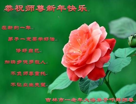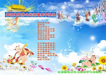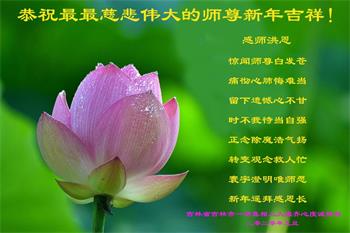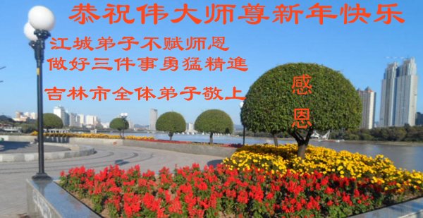 恭祝最最慈悲伟大的师尊新年快乐! 感师洪恩 惊闻师尊白发苍 痛彻心肺悔难当 留下遗憾心不甘 时不我待当自强 正念除魔浩气扬 转变观念救人忙 寰宇澄明唯师愿 新年遥拜感恩长 吉林市江城全体大法弟子恭祝师尊新年快乐!