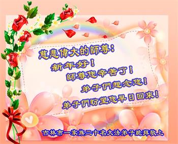 师尊新年好!师尊您辛苦了! 弟子们想念师尊,每天都在盼望着您能够回到中国大陆,回到家乡。弟子们在法中有修的不好的地方,一定会多学法,对照大法修好自己,多救人,兑现史前誓约,紧跟师尊回家。 吉林市一家族二十名大法弟子跪拜敬上 吉林省吉林市全体大法弟子恭祝慈悲伟大的师尊新年好!