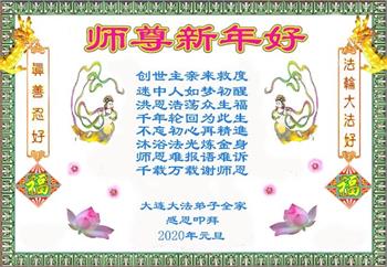 法轮大法 生命之宝 师恩浩荡 宇宙开创 慈悲救度 神佛千万 弟子有缘 得宝修炼 修身炼心 溶法净化 助师正法 兑现誓约 随师回归 天门大开 众生喜迎 齐叩师恩 跪拜师父 大连大法弟子 2019年12月23日 辽宁省大连市金普新区一学法小组的大法弟子及家人恭祝师尊新年快乐!