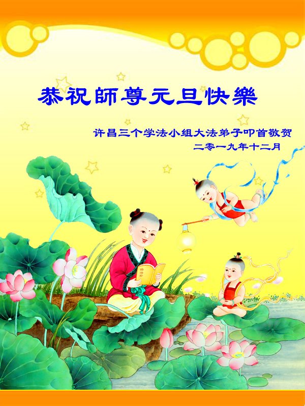 2020年元旦即将到来,我们伊川县全体大法弟子感恩师尊对众生的苦度! 过去的一年里,我们在做好三件事、救度众生上,各显神通,不忘使命。新的一年里,我们在师尊的加持下,更加精進,用大法赋予弟子的智慧和能力,救更多的有缘人! 祝师父元旦快乐! 河南省伊川县全体大法弟子 2019年12月27日 河南许昌三个学法小组大法弟子恭祝慈悲伟大的师尊新年快乐!