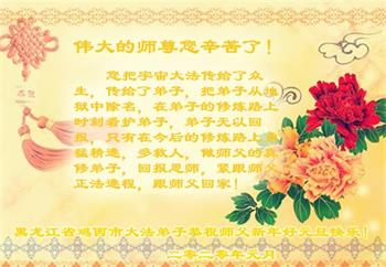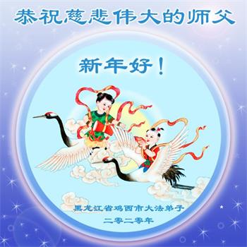 师父好!弟子想念师父,感恩师父慈悲救度。我在最痛苦的时候无数遍的喊师父,喊师父救我。疼痛到了极限,我泪眼模糊望着师父的照片,师父慈父般的目光里充满了怜爱,充满了鼓励,充满了无限的慈悲和些许的担忧。 我从心底发出:师父啊,放心吧,跟您修炼大法这条路,弟子走定了,无论多么艰难,弟子永不言弃,兑现誓约随师还。 师父一次次救了弟子,前面的路会越走越明。弟子感恩师父!师父为弟子、为众生承受了巨大的业债,师父消了全宇宙所有众生的罪业,使众生能走到今天,有了被救度的机会,任何一个生命对师父对大法的不敬就是用无边的罪业都无法形容其万一。迷途中的生命,千万不要等着真相大显时才不得不明白,那时就悔之晚矣! 鸡西大法弟子 黑龙江省鸡西市密山市两位大法弟子祝师父新年快乐!
