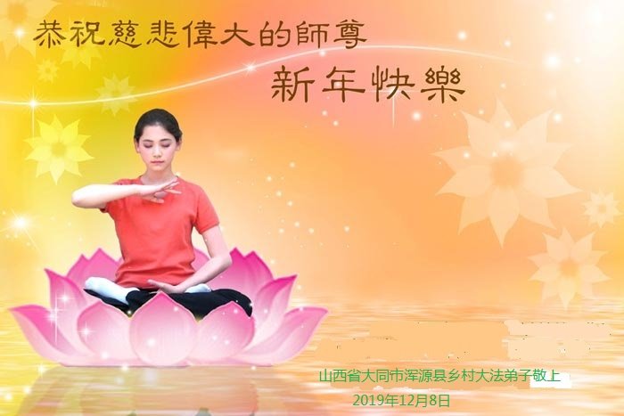 恭祝师尊新年快乐!感谢师父一路慈悲的保护与救度!用尽一切语言表达不了师父对弟子的慈悲恩德,今后弟子要用真善忍大法衡量自己,洗净自己,做一个堂堂正正的大法弟子,尽我的一切最大努力做好三件事,多救人、快救人。 谢谢慈悲伟大的师父! 山西省大同市浑源县乡村一大法弟子恭祝师尊新年快乐!
