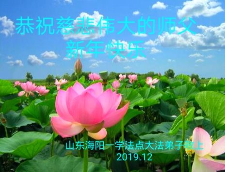阳历新年就要到了,弟子衷心感恩在师父二十多年来对弟子的慈悲保护与点悟下,让弟子能坚定的走在修大法的正道上。谢谢师父!最后恭祝师父新年快乐! 烟台市牟平区一农村老年大法弟子敬上 山东德州乡村大法弟子恭祝师尊2020新年快乐!