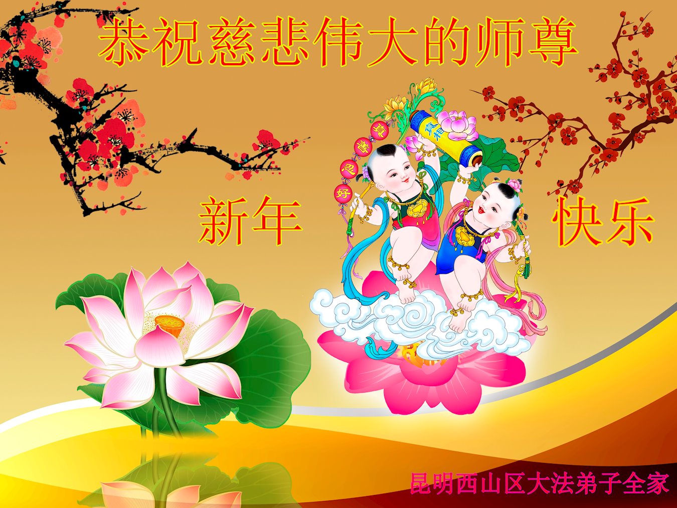 云南省昆明市西区一大法弟子全家恭祝师尊新年快乐!