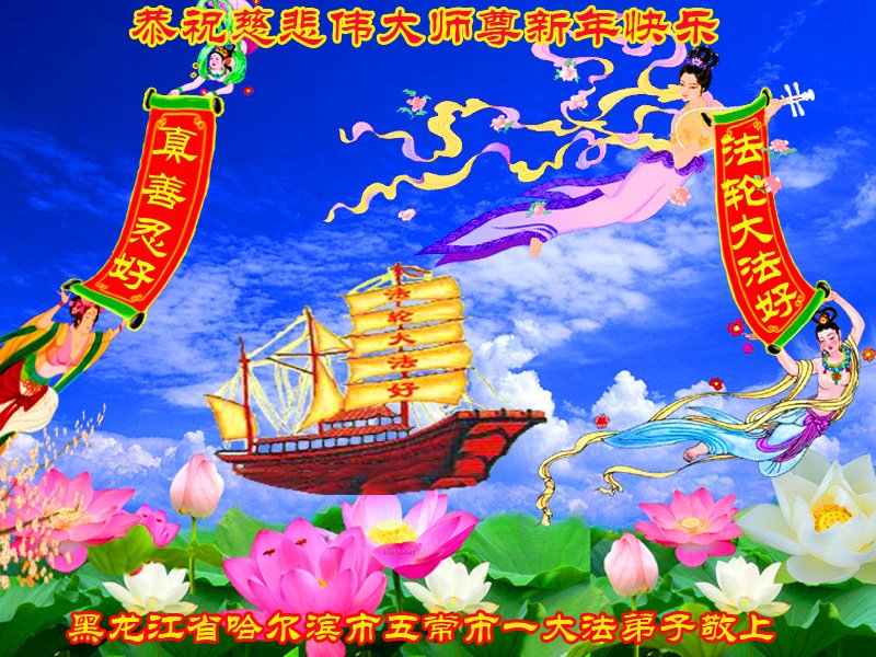 师尊度人慈善 大法世界洪传 教我修真善忍 明真假识恶善 心清身轻受益 改头换面新颜 佛法博大无边 恶魔百般阻拦 大法徒受魔难 师把舵抵狂澜 兑誓约救众生 紧随师乘法船 黑龙江省哈尔滨市木兰县一大法弟子恭祝师尊元旦快乐!