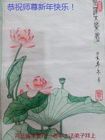 莲 圣莲不染尘 本质净又纯 姿美散香风 圣洁留世人 一九九六年三月我有幸修炼法轮大法,感谢慈悲伟大师尊的珍惜、保护,我走过了二十三个春秋。现敬献工笔画——莲,和诗一首,恭祝师尊新年快乐! 河北省辛集市一老年大法弟子拜上 二零一九年十一月十二日 河北省石家庄市辛集市两个学法小组的大法弟子祝愿伟大的师尊新年快乐!