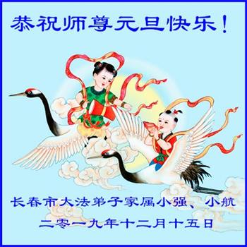二零一九年即将过去 二零二零年即将到来 大陆德惠市一学法小组 恭祝师尊新年快乐! 恭双手合十叩拜师尊 在这特殊的历史年代 我们能成为师尊弟子 百感无上荣耀 百感快乐幸福 在新的一年里 用神的观点 用神的思维 用神的状态 走在神路上 要精進实修 做好三件事 兑现誓约 完成使命 不负众盼 随师回家 吉林省长春市德惠市一学法小组2019年12月26日 恭祝师父新年好! 长春大法弟子: 在二零二零金鼠年到来,感恩师父为我这不争气的弟子在魔难中,不知为我承受了多少,为我操尽了心,在一次次跌倒中把我扶起,再往前送。点化、鼓励、给予智慧、成全弟子。跟头把式走到今天全是师恩浩荡无以言表。千言万语汇成一句话,我仅代表我全家人怀抱着无比虔诚的心向慈悲伟大的师父拜早年,恭祝师父新年好! 2019年12月26日 吉林省长春大法弟子家属祝师尊元旦快乐!