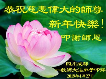 弟子围坐比修心 尊师敬法炼功勤 时时事事修心性 关难面前法理清 助师正法不畏苦 寒来暑往救人急 可歌可泣修炼人 横扫阴霾寰宇新 斗转星移新春至 法徒精進志不移 师恩难忘诉不尽 恢复传统佛光临 七台河市教育界大法弟子 二零一九年一月二十四日敬上 四川省成都市一教师大法弟子恭祝慈悲伟大的师尊新年快乐!