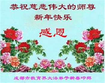 尊敬的师父好,您辛苦了!我是陕西大法弟子,我代表全家子孙三代十四口人,向慈悲伟大的师尊拜年了!谢谢师尊慈悲救度!感恩师父给了我们这个大家庭和睦温馨,幸福愉悦!我们家庭成员中有工程师、设计师、教师,从西北到东南,从国内到国外,包括亲朋好友都得到师父的保护和大法的恩泽。师父为弟子承受了巨大的关、难,在我痛苦的生不如死的无望中,我有幸喜得大法,从此走上修炼道路。师父《转法轮》的博大法理,净化了我的心灵,在很短的时间里,使我身体达到了无病一身轻,二十多年来没有吃过一粒药。师父从地狱里把我捞起,给了我第二次生命。师父几十年如一日的看护着弟子,并赐给结婚多年不生育的儿媳一个健康可爱的儿子。家人、亲戚、朋友都亲眼见证了师父的慈悲、大法的神奇,陆续也走入大法修炼中来。儿子乐于助人,在街上遇到没钱看病的人,自己掏二千多元的住院费让孩子赶快住院治疗且不留姓名。女婿在商场捡到钱包交给值班保安,内有四千多元现金和证件,当保安要留他电话以备失主答谢时,女婿说不用了。大法使他们都成为对社会有用的人,弟子无以言表对师父的感恩。在师父用巨大的付出换来的有限时间里,弟子只有精進实修,做好三件事,以报师恩。 四川省成都教育界大法弟子恭祝师尊新年快乐!
