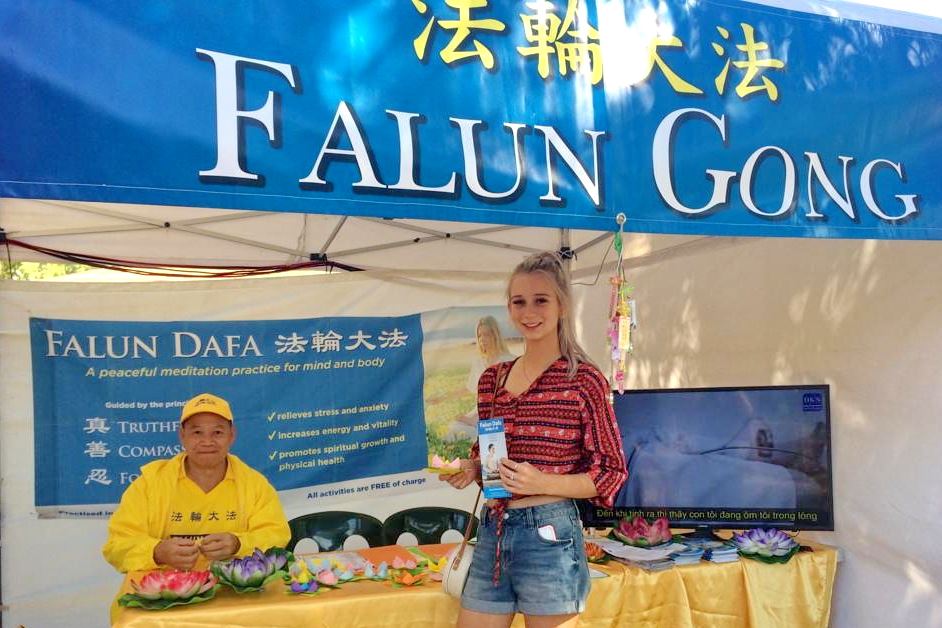 越南社团很多人都对法轮功有兴趣,法轮功学员特地为他们准备了越南文的简介,播放越南语的视频,受到他们的欢迎。法轮功学员做了多次功法展示,每次都引来许多民众的关注。人们对法轮功很感兴趣:有的觉的“真善忍”就是好;有的感受到功法的能量场;有的人被平静祥和的炼功动作所吸引。 南澳北区普雷夫(Playford)的市议会议员凯蒂(Cathy-Jo Tame)看到学员在炼功,跟自己的孩子介绍说法轮功非常好,她说自己多年前在公园和大家一起炼过,她希望有机会请法轮功学员到北区办教功班。 越南女子坤烨(Kunye)说:“我知道法轮功很多年了,一直想炼,今天特来问问。”法轮功学员告诉她任何人都可以学,免费教功。 学员介绍说:“法轮功要求按照真善忍修炼心性,而不只是炼动作,这样才能提高。”她高兴地说,“对,应该的。请给我炼功点的简介,我会来的。”  图4:澳洲女孩瑞秋·玛斯顿(Rachael Marsden) |