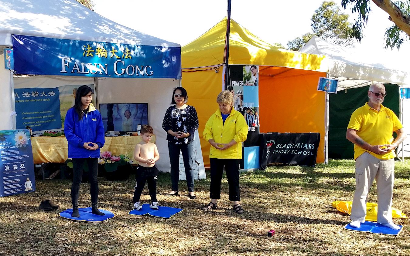 澳洲女孩瑞秋·玛斯顿(Rachael Marsden)也被炼功展位吸引,她说自己母亲在越南社区教英语,她很喜欢东方文化,不久将去中国和其他亚洲国家旅行。她表示法轮大法祥和的能量场和真善忍的精神修炼正是她要找的,旅行回来后就来参加炼功。  图5:图中男孩只有四岁,因为玩热了,他母亲帮他脱下上衣。也许感受到功法展示的祥和能量场,他径直跑到法轮功展位来,拿起一个坐垫,站到正在展示功法的学员当中,认真跟着学起炼功动作,样子纯真可爱。 |
