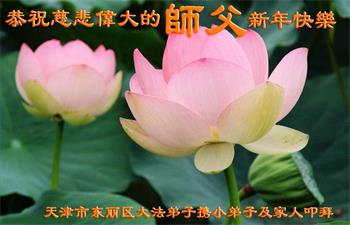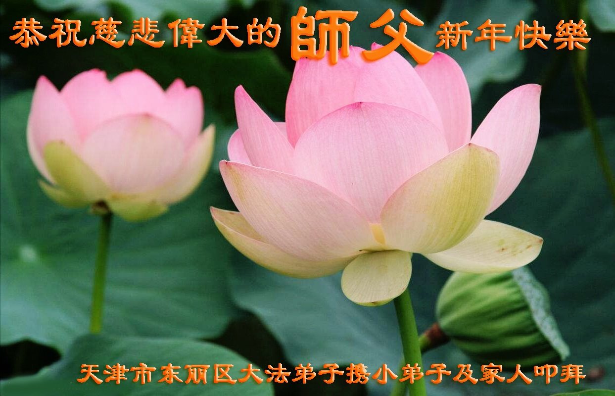 天津市东丽区大法弟子携大法小弟子及家人恭祝慈悲伟大的师父乙亥年新年快乐!