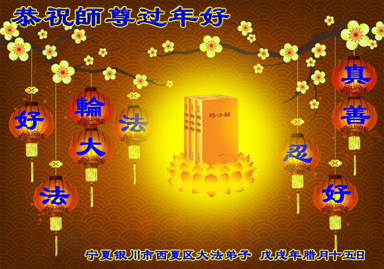 恭祝师尊过年好! 法徒众生齐欢耀。 协力做好三件事, 回家神路佛光照。 宁夏回族自治区银川金风区大法弟子恭祝师尊过年好!