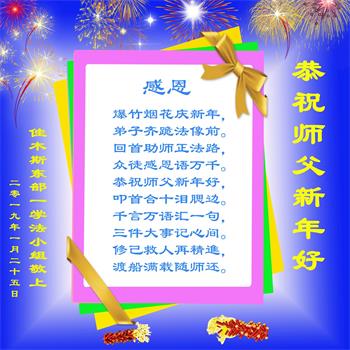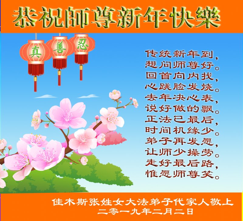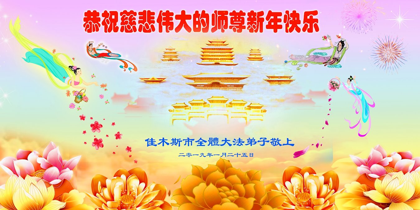 佳木斯市全体大法弟子敬上 二零一九年一月二十五日 黑龙江佳木斯张姓女大法弟子代家人恭祝师尊新年快乐!