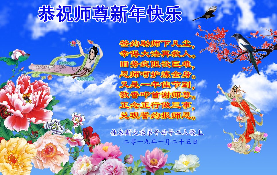 佳木斯市东部母子大法弟子敬上 二零一九年一月二十五日 黑龙江佳木斯市一大法弟子代全家恭祝师尊新年快乐!