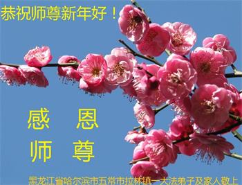师父您好! 新春佳节之际,弟子们想念师父,盼望早日和师父团聚。在今后的正法洪流中,弟子们一定要倍加努力,做好三件事多救人。让师父少一些操劳多一些欣慰。弟子们叩拜师尊。 哈尔滨市香坊区一学法小组。 黑龙江省哈尔滨市五常市拉林镇一大法弟子及家人恭祝师尊新年好!