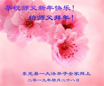 师尊您辛苦了!弟子无法用语言表达对师尊的感恩之心。唯有在新的一年里更加精進,修好自己,多学法,多背法,兑现誓约,不辱使命。 河北省沧州市东光县一讲真相小组全体大法弟子祝师尊新年快乐!