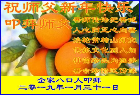 吾师传法把吾喊 人心归正心向善 法轮常转山河变 传统文化到人间 神韵珍品内涵多 吾会珍惜这份缘 全家八口人祝师父新年快乐!叩拜师父! 二零一九年一月三十一日 吉林省长春市大法弟子恭祝师尊过年快乐!