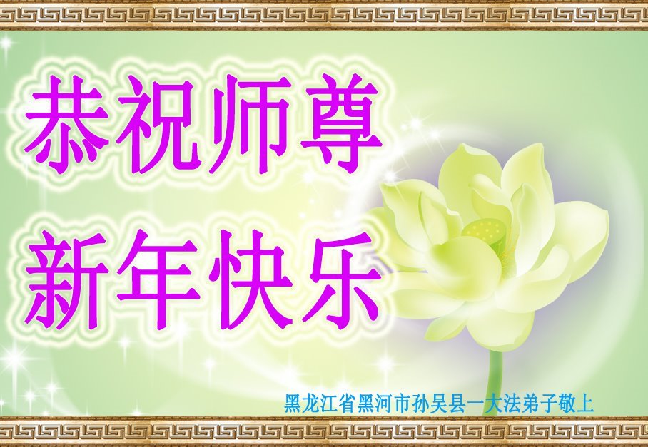 恭祝慈悲伟大的师尊新年快乐! 感恩师父的慈悲,用巨大的承受延长时间,使弟子有机会从新走入修炼,为弟子净化身体,在修炼的路上都是师父的保护,弟子也是跌跌撞撞的走到今天,弟子只有做的更好,才能回报师父,惟愿师尊笑。 黑龙江省黑河市孙吴县一大法弟子敬上 二零一九年一月三十一日 黑龙江省绥化市一家庭学法小组大法弟子恭祝师父新年快乐!