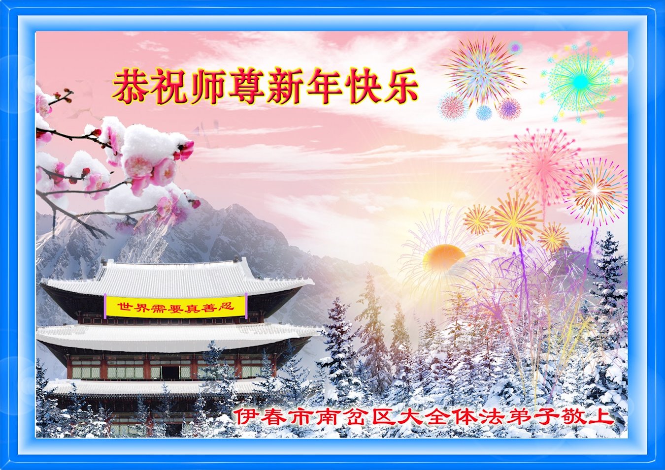 我们的学法小组在师父的慈悲保护下,已经十六年了,不论是八十多岁的老年同修,还是四、五十岁的中年同修,都风雨不误,坚持学法,在新年到来之际,我们祝师尊新年快乐! 黑龙江伊春市南岔区全体大法弟子恭祝师尊新年快乐!