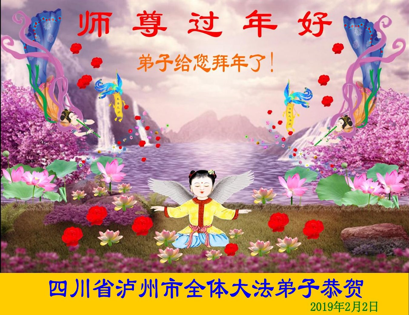 拜年! 跪拜师尊过年好! 洪恩浩荡无以报 唯有做好三件事 勇猛精進不动摇 四川省泸州市一学法点弟子恭贺 2019年2月2日 四川省泸州市全体大法弟子恭祝慈悲伟大的师尊过年好!