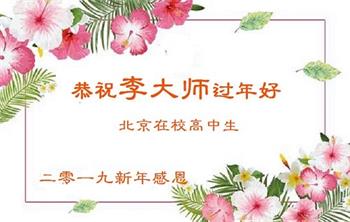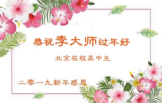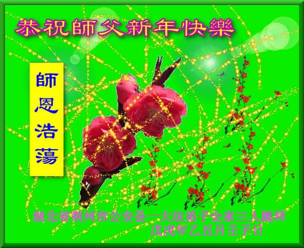 | 【明慧网二零一九年二月四日】(明慧网通讯员综合报道)法轮大法自一九九二年五月由李洪志师父传出,上亿人入道得法,获得了身心的健康和道德的升华。生活在法轮大法学员身边的亲人、朋友、同事等,明白真相后,诚念“法轮大法好”,获得了善报,有曾身染重症不治而愈的;有开智开慧取得好成绩的;有的遇难呈祥,家庭和睦幸福。 河北省秦皇岛一家人深感李洪志师父讲的法轮大法的道理,不但改变人的心灵,也神奇改变信仰者的健康状况,他们在贺词中说:“二零一八年九月份,身患癌症的七十六岁的老父亲,听了一遍师父讲法录音,奇迹就发生了,癌症变成了囊肿,囊肿也快速变小。父亲现在也开始看书学法了。” 北京一高中生说:“(高烧)刚感觉自己难受,我就开始心中默念‘法轮大法好、真善忍好、李洪志大师好、李大师救我’,我的心就平静了,慢慢的不适症状就消失了,晚上熄灯前,校医来寝室给我们剩下的几个学生量体温,我的体温正常。” 每一位大法弟子都亲身感受到“一人炼功全家受益”,时时有神助。在中国传统佳节到来之际,这些得到大法福泽的百姓给李大师发来贺词,感谢师父的救度之恩,祝师父新春佳节快乐! 湖北省荆州市公安县一大法弟子全家三人恭祝师父新年快乐!