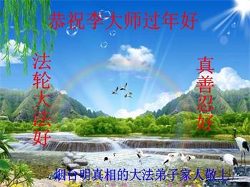李大师过年好! 谢谢李大师为众生所做的一切!我们两家明白了法轮功被迫害的真相,为自己和家人都选择了一个美好的未来。 我们全家常念法轮大法好,真善忍好,都得了福报,做什么都顺,真是万事如意。谢谢李大师!我们全家永远支持法轮功,支持您和大法弟子所做的一切。 跪拜李大师!祝您万事如意! 烟台明真相大法弟子家人恭祝李大师过年好!