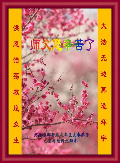 河北邯郸峰峰区夫妻二人大法弟子恭祝师尊新年快乐! 河北衡水大法弟子和全家恭祝伟大的师尊新年快乐!