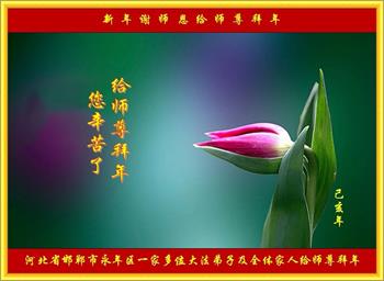 河北邯郸峰峰区全体大法弟子恭祝慈悲伟大的师尊新年快乐! 河北邯郸磁县一八旬女大法弟子恭祝慈悲伟大的师尊新年好!