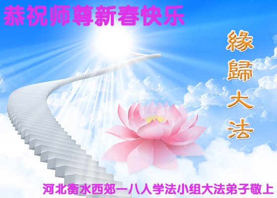 尊敬的师父您好! 我们夫妇大法弟子在这新的一年里一定走好您给我们安排的修炼路,完成使命跟师父回家。请师父多一份欣慰,少一份操劳。 河北衡水西郊一八人学法小组全体大法弟子恭祝师尊新春快乐!