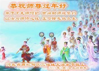 师尊您好!师尊辛苦了! 在新的一年里,我们会更加精進,严格要求自己,修好自己,不辜负师尊的慈悲救度! 河北省曹妃甸区大法弟子三姐妹敬上! 河北省邯郸市永年区夫妻大法弟子己亥年给师父拜年!