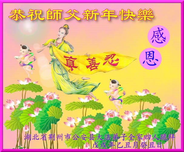 恭祝师尊过年好!感恩师尊慈悲救度!大礼叩拜师尊! 湖北省荆州市公安县一大法弟子全家四人恭祝师尊新年快乐!