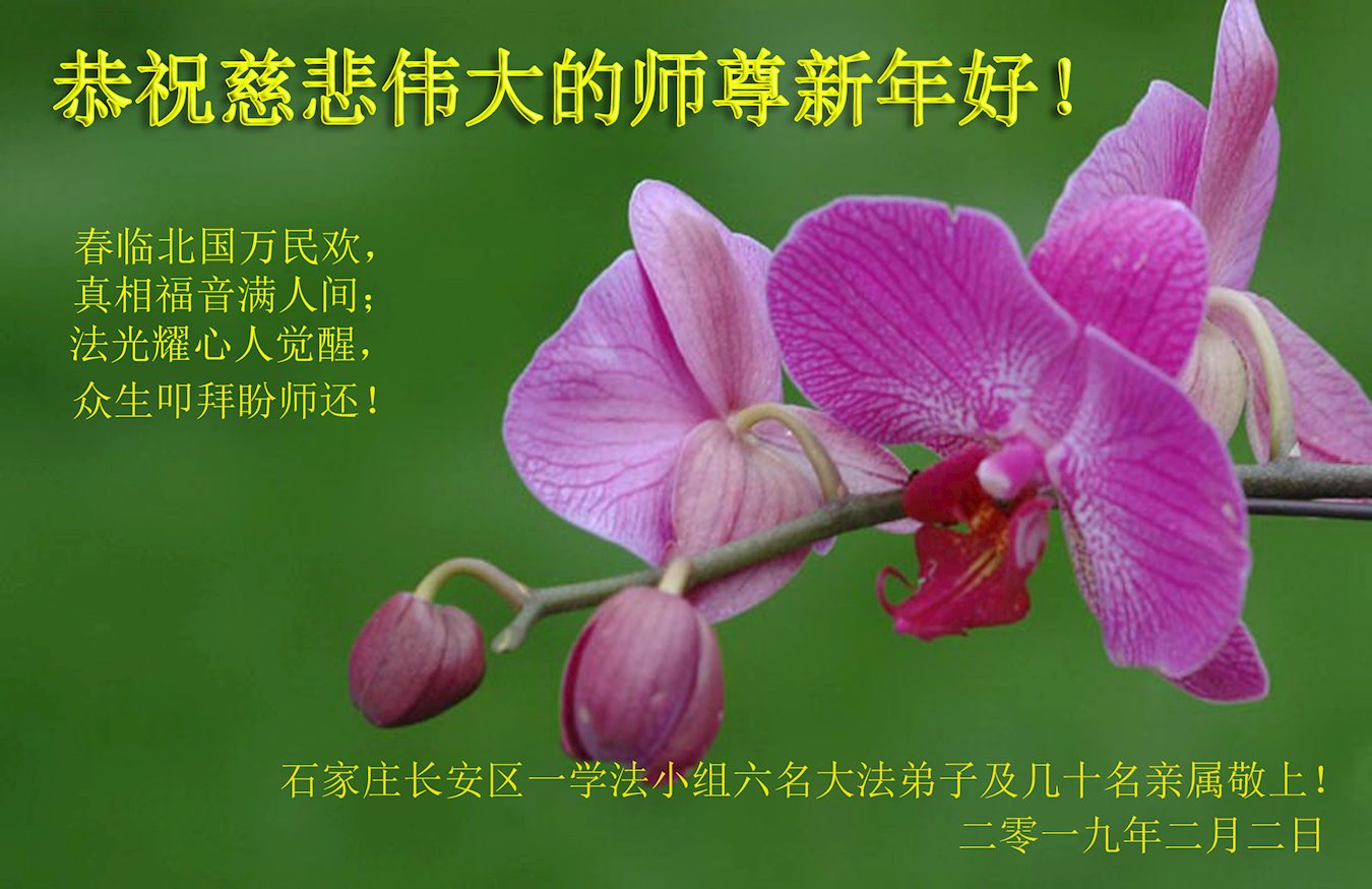 爆竹一声除旧岁 红梅万朵报新春 恭祝师尊新年好 弟子叩首拜师尊 河北石家庄市长安区青年大法弟子 二零一九年一月二十九日 河北石家庄市长安区一中老年四人学法小组大法弟子恭祝师尊新年快乐!