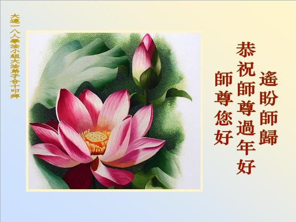 感谢恩师的加持!在过去的一年里,弟子可以完整的将《转法轮》背下来了,在新的一年里,弟子要在讲清真相上多下功夫,不负师尊的慈悲苦度! 辽宁省大连市甘井子区大法弟子恭祝师父过年好!