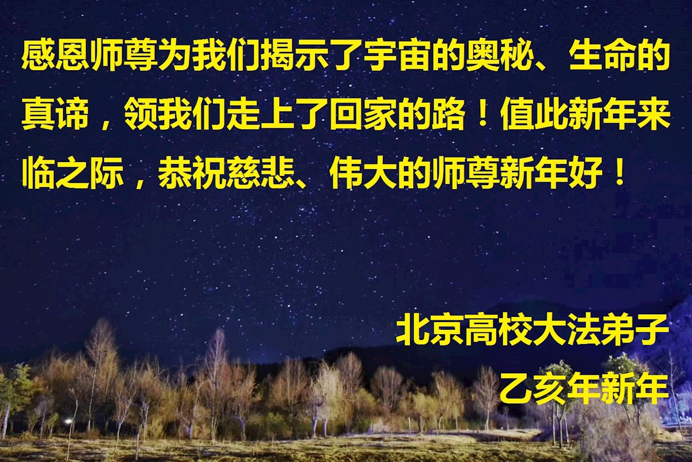感恩师尊为我们揭示了宇宙的奥秘、生命的真谛,领我们走上了回家的路!值此新年来临之际,恭祝慈悲、伟大的师尊新年好! 北京高校大法弟子 乙亥年新年 东北石油大学全体大法弟子恭祝师尊新年快乐!